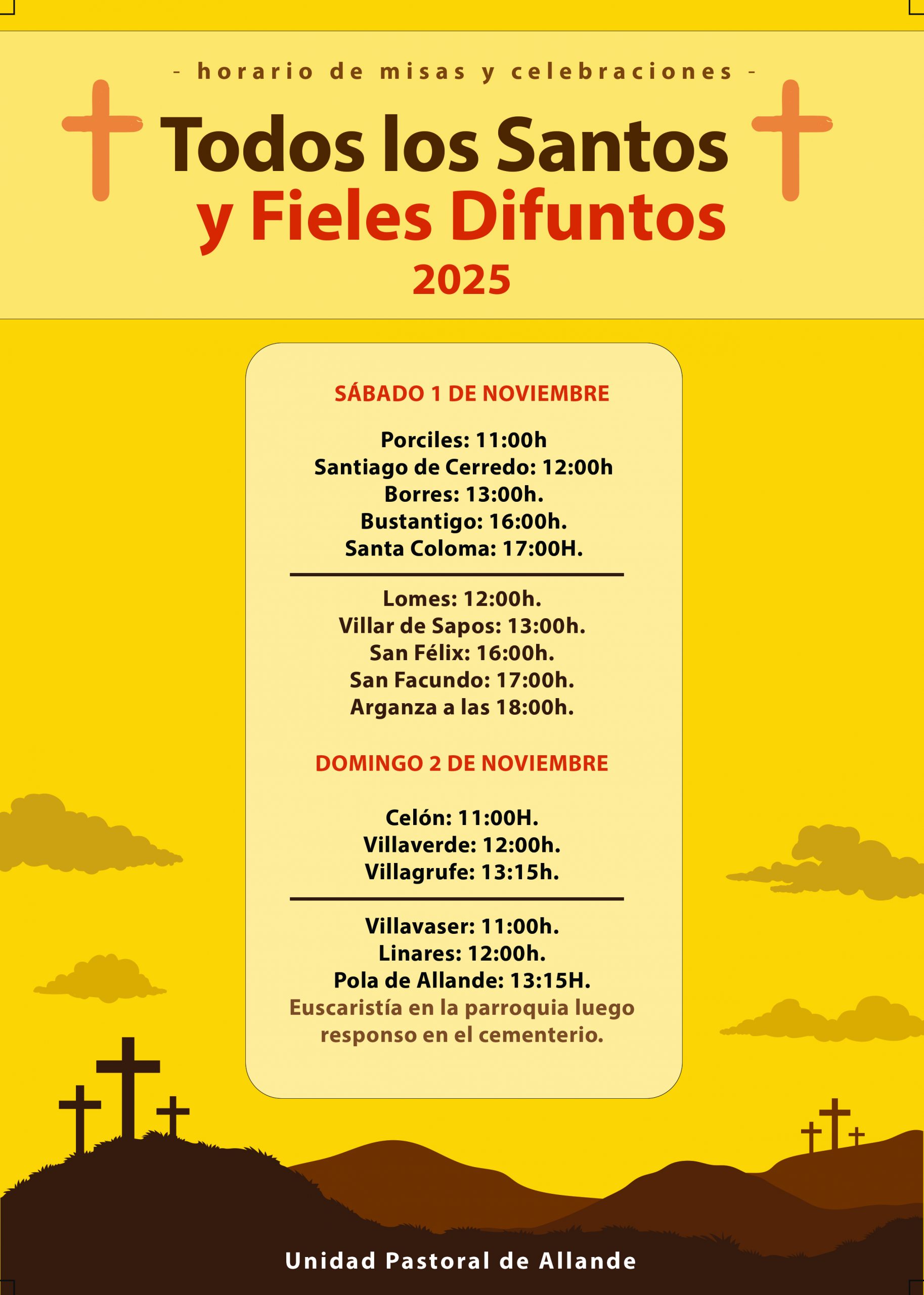 En estos días de recuerdo y oración, cuando la Iglesia universal eleva su plegaria por todos los que nos han precedido con la señal de la fe, la Unidad Pastoral de Allande les invita cordialmente a participar en los sagrados cultos que celebraremos con motivo de: